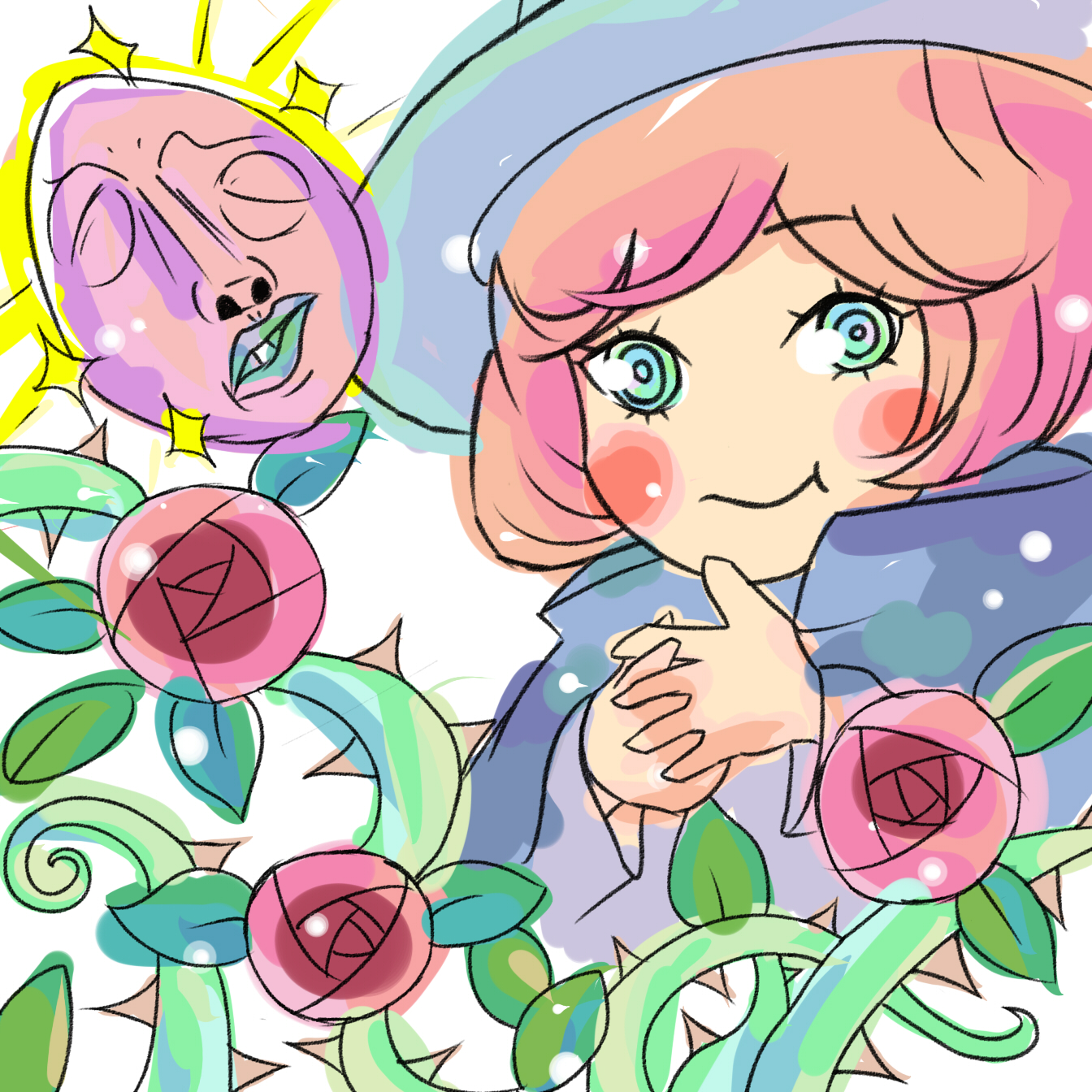 1990s (style)1girlblushblush stickersfemale focusflowergreen eyeshatlooking at viewerorange hairplantretro artstyleroseshort hairsimple backgroundsolosun hatthornsvineswhite background