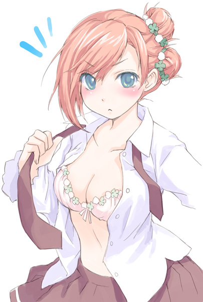 1boy1girlangryblue eyesblushbrabreastscleavagefemale focushair uplingeriemedium breastsmidriffopen clothesopen shirtpink hairschool uniformshirtsolosurprisedunderwear