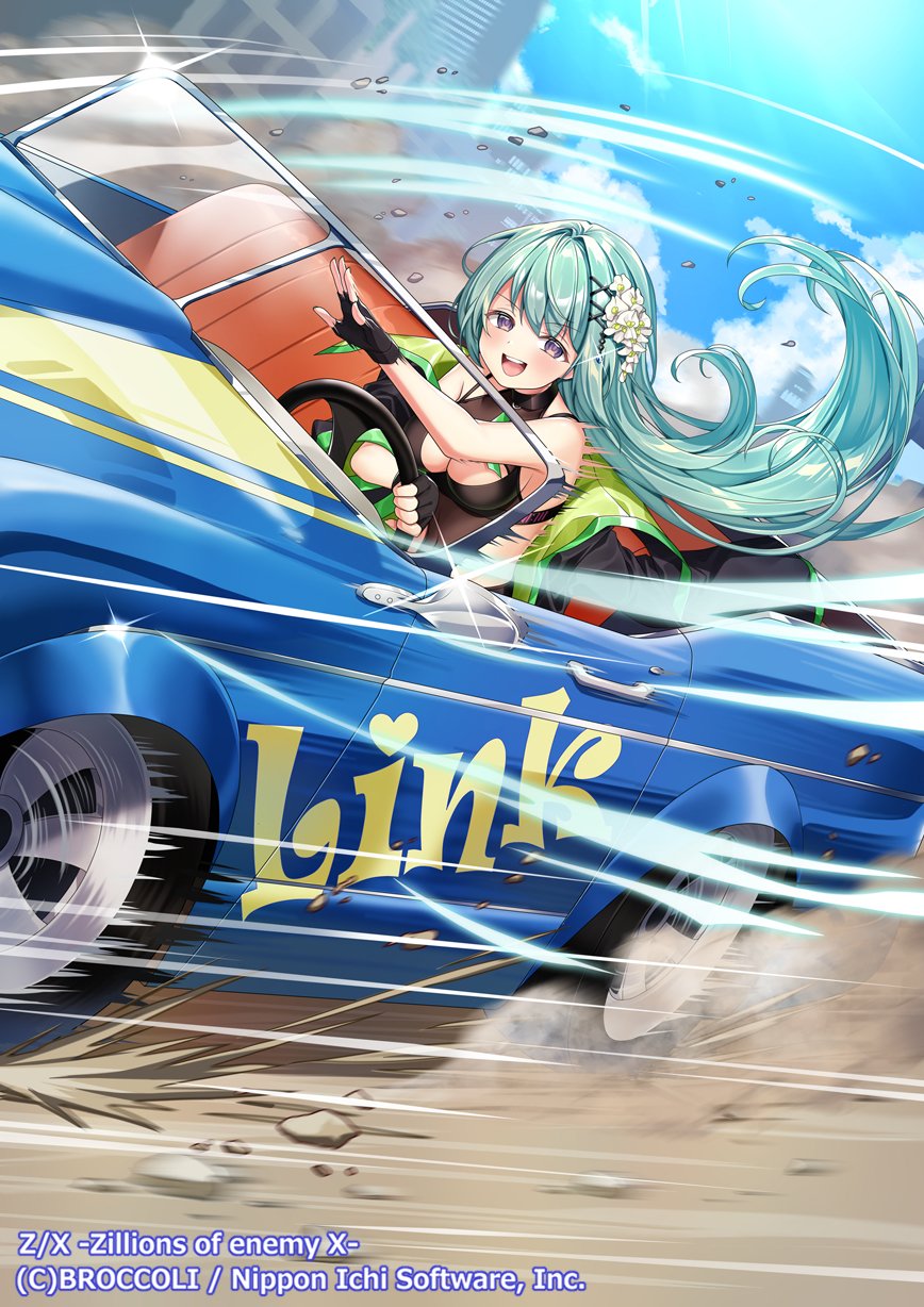 1girlblack glovesblack jacketblue carblue skybreastscarcleavagecleavage cutoutclothing cutoutcopyright noticecovered naveldrivingfingerless glovesfloating hairflowerglovesgreen hairhair flowerhair ornamentholding detached steering wheeljacketleft-hand drivelong hairmotion linesmotor vehicleopen clothesopen jacketopen mouthoutdoorspurple eyesskysolosparklespeed linessteering wheelteethupper teeth only
