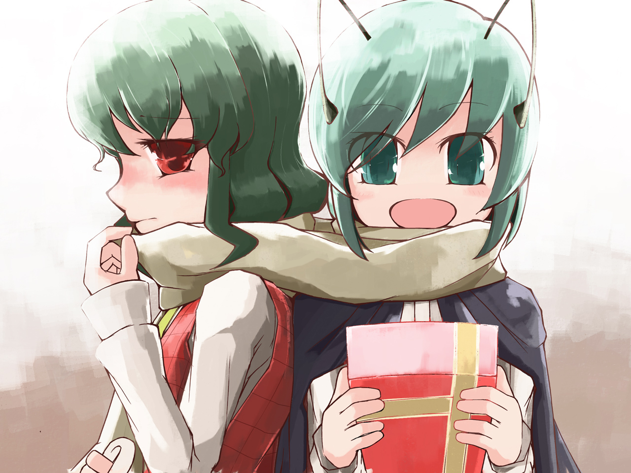 2girlsantennaeblushfemale focusgiftgreen eyesgreen hairhappyholdingholding giftmultiple girlsplaid clothesplaid vestred eyesscarfshared clothesshared scarfvest
