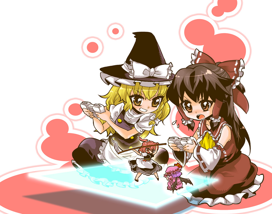 4girlsbat wingsblonde hairbowbraidbrown eyescontrollerdetached sleevesfemale focusgame controllerhair bowhathologramjapanese clothesmikomultiple girlsplaying gamespurple hairred eyesred hairribbonscytheshort hairside braidskirttwintailstwo side upvideo gamewhite backgroundwingsyellow eyes