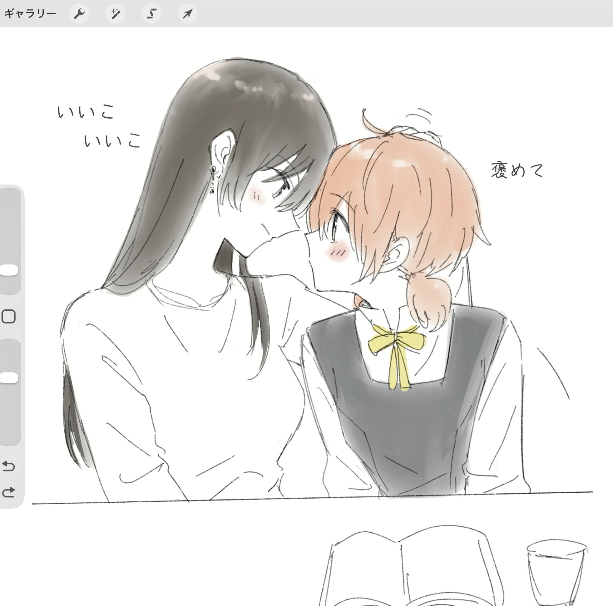 2girlsahogeanimal earsart program in frameblack hairblushclosed moutheye contactheadpatlong hairlooking at anothermultiple girlsorange hairschool uniformtohmi higashi high school uniformupper bodywhite backgroundyuri