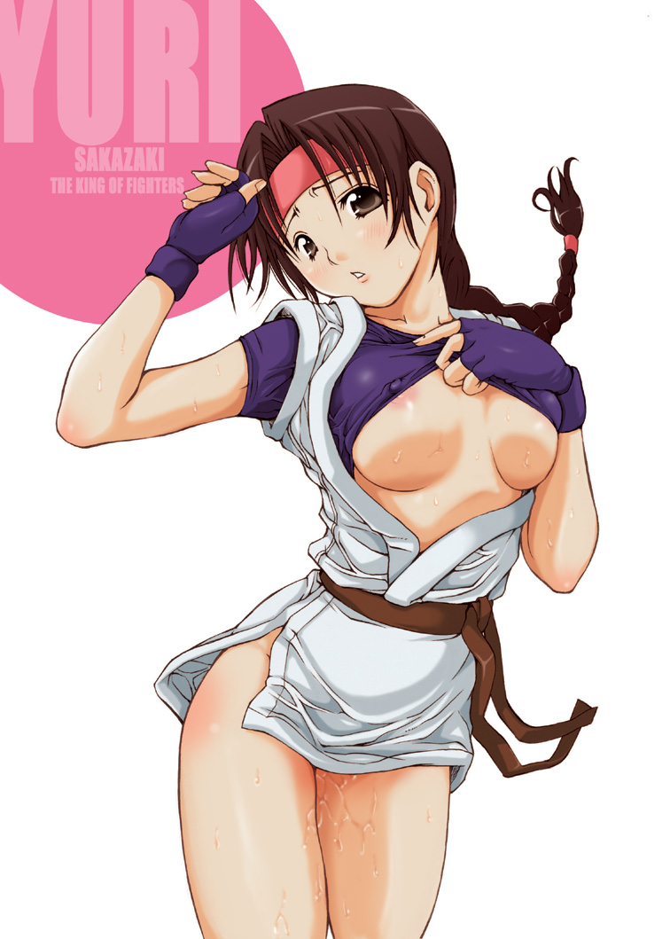 1girlblushbraidbreastsbrown eyesbrown hairclothes liftdougifemale focusfingerless glovesglovesheadbandopen clothesshirt liftsolo