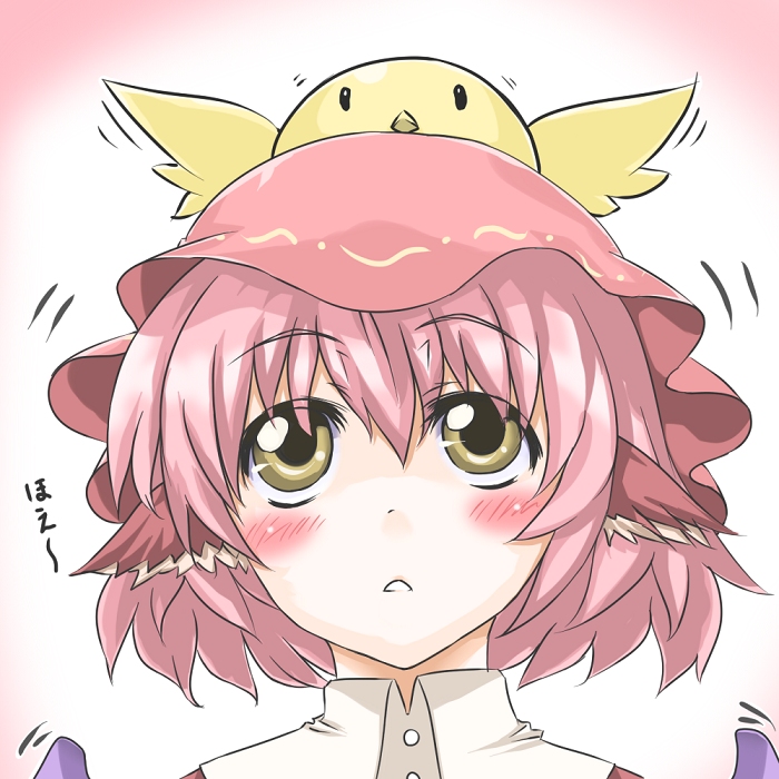 1girlanimalanimal earsanimal on headbaby animalbirdbird on headblushchickfemale focushatlooking upon headpink hairportraitshort hairsoloyellow eyes