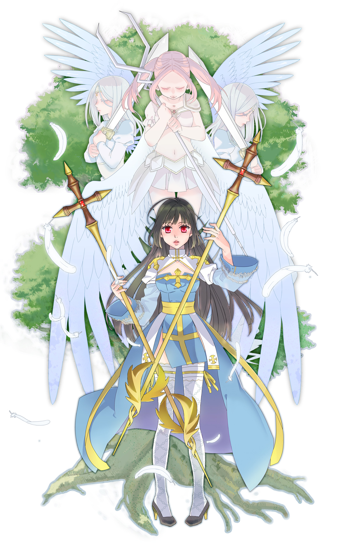 4girlsahogeangelblack hairblack shoesblue dressblue wingsbreastscleavage cutoutclothing cutoutcrosiercrossdressdual wieldingfalling feathersfeathered wingsfeathersfishnet thighhighsfishnetsfrilled thighhighsfrillsfull bodygrey hairhigh heelsholdingholding staffholding swordholding weaponjuliet sleeveslong hairlong sleeveslooking at viewermedium breastsmultiple girlsnavelopen mouthpink hairpuffy sleevesred eyessashshoesstaffswordthighhighstreetwintailstwo-tone dressweaponwhite backgroundwhite dresswhite thighhighswingsyellow sash