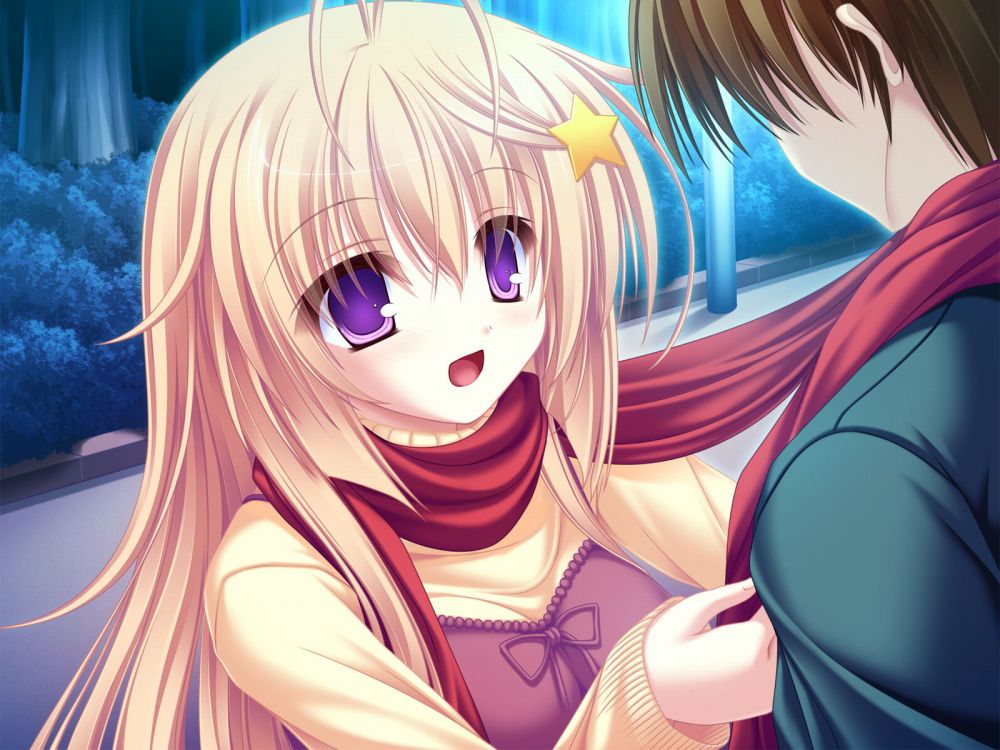 1girlantenna hairblonde hairhair ornamenthairclippurple eyesscarfshared clothesshared scarfsolo focusstar (symbol)star hair ornament