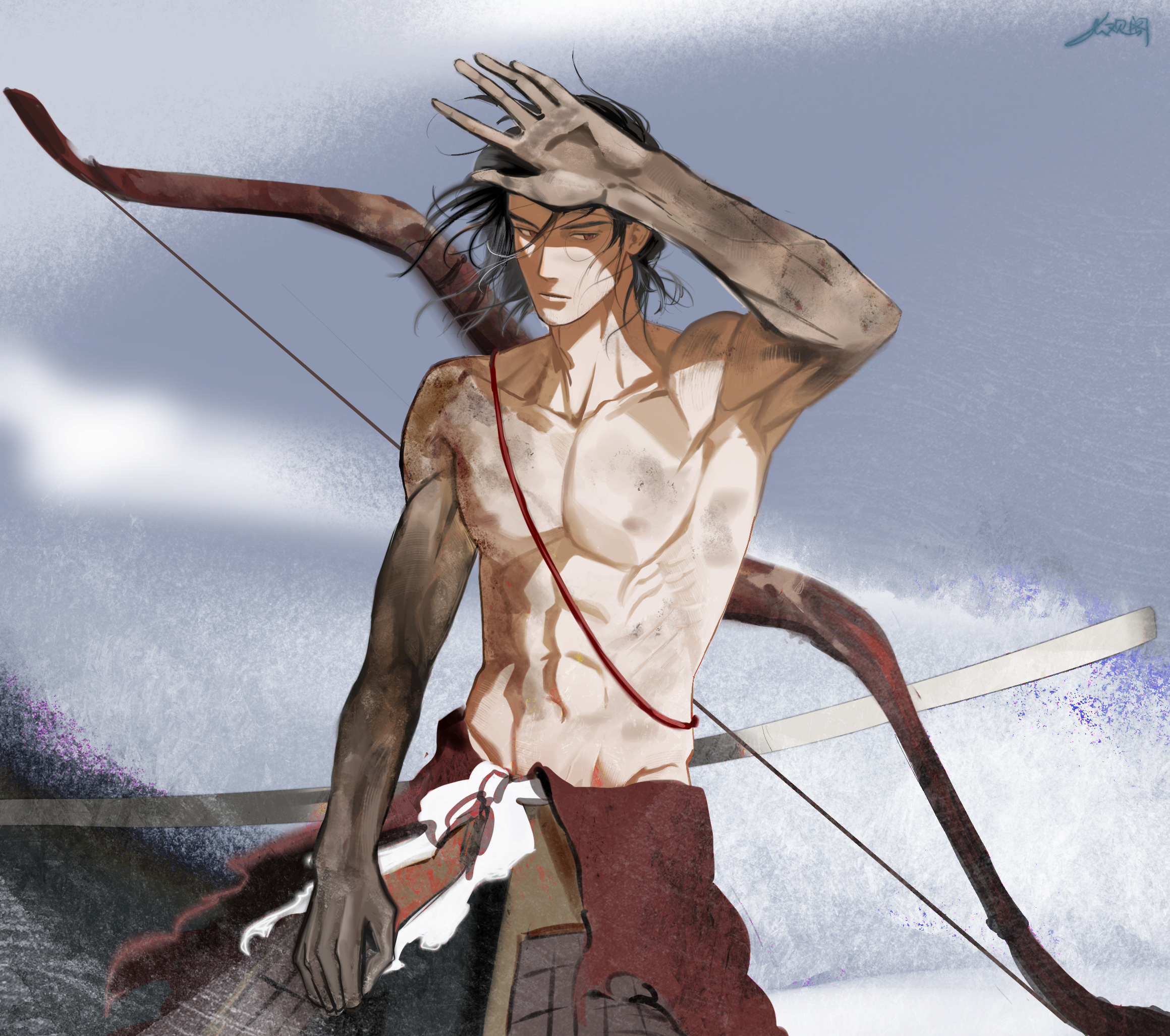 1boyabsarm upblack hairbow (weapon)closed mouthdirty armmale focusmessy hairribsshading eyesshort hairsolotonedtoned maletopless maleweapon