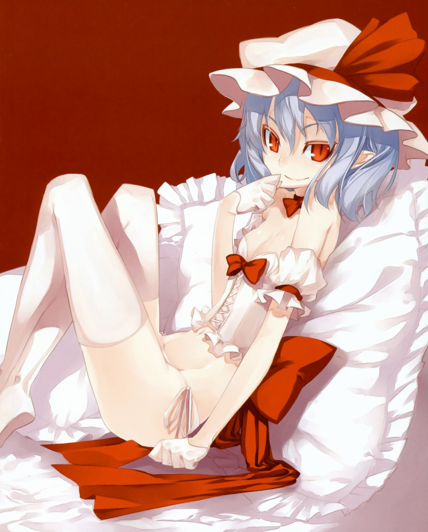 1girlartistic errorbare shouldersbarefootbedblue hairbowbustierchokercolored eyelasheseyelashesfeetfemale focusflat chestfrilled pillowfrillshatlingerielowleglowleg pantiesmidriffnaughty faceorange eyespantiespillowred eyesribbonside-tie pantiessittingsolothighhighsunderwearwhite pantieswhite thighhighs