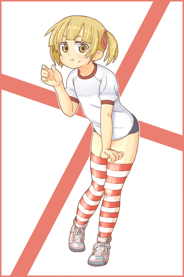 1girlblonde hairburumafemale focusgym uniformshort hairshort twintailssolostriped clothesstriped thighhighsthighhighstwintailsyellow eyes
