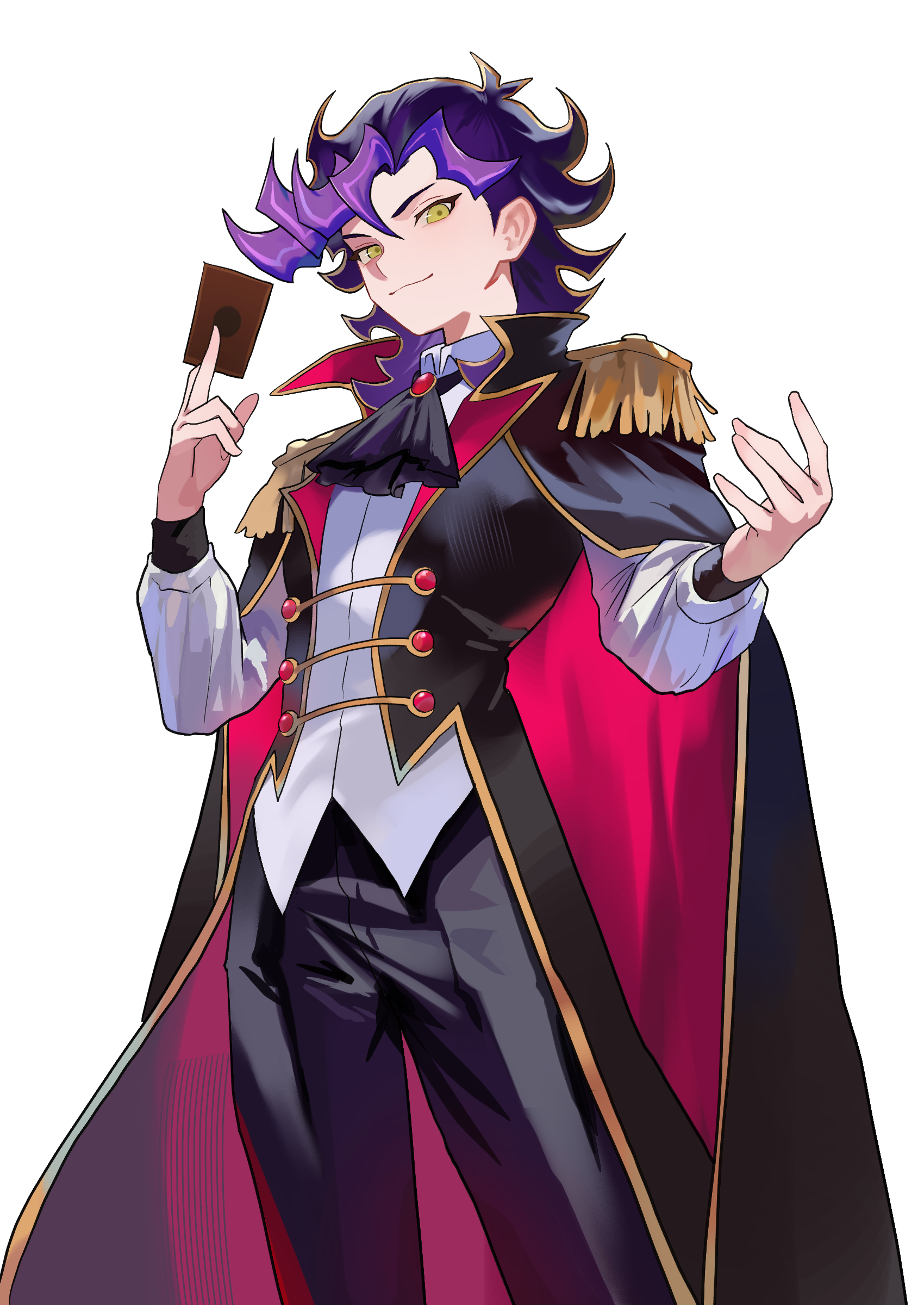 1boyblack capeblack coatblack hairblack pantscapecardcoatholdingholding cardmale focusmulticolored hairpantspurple hairshirtsimple backgroundsolotrading cardtwo-tone hairwhite backgroundwhite shirtyellow eyes