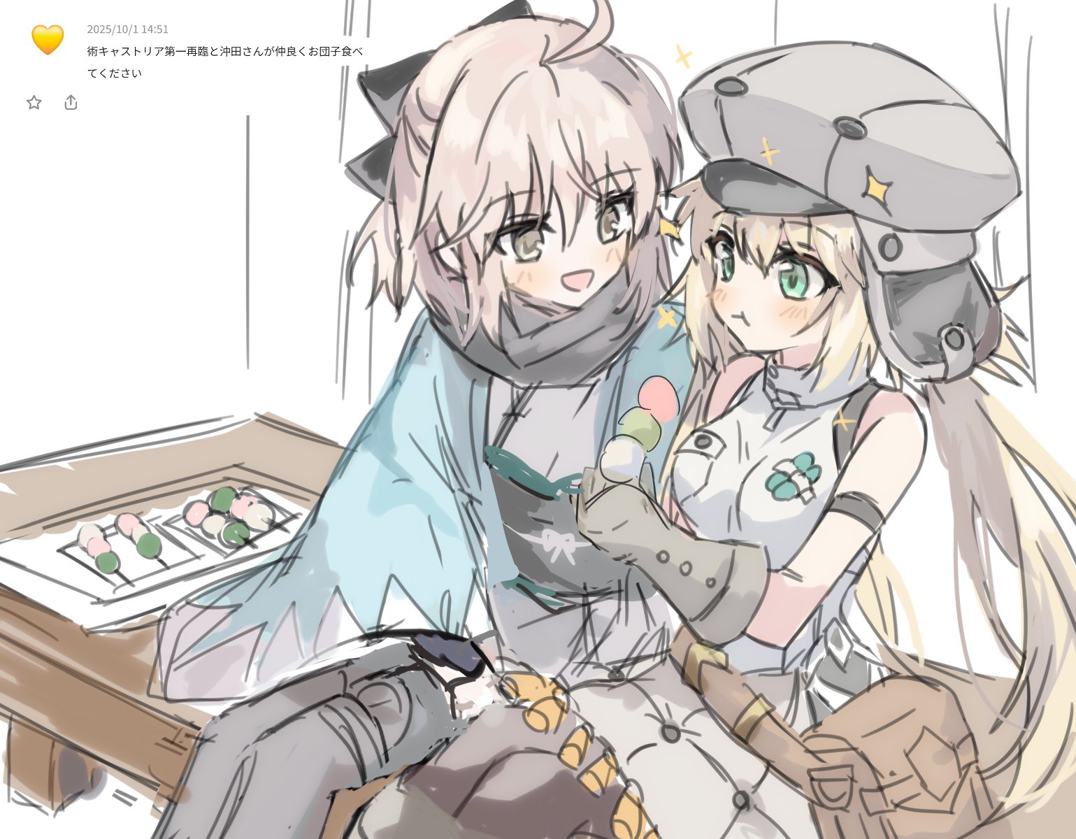 kurame, saya (saya no uta), futaba channel, guro cure, kusari hime: euthanasia, saya no uta, eyebrows, 2girls, bare arms, brown hair, covering own mouth, crossover, green hair, hair between eyes, head tilt, index finger raised, long sleeves, looking at viewer, multiple girls, open mouth, red eyes, short hair, sidelocks, sleeves past wrists, smirk