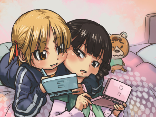 2girlsbedbrown eyesbrown hairdrill hairhair ribbonhandheld game consolejacketmultiple girlsnintendo dsplaying gamesribbonshort hairshort twintailsstuffed animalstuffed toystylustwintailsvideo game