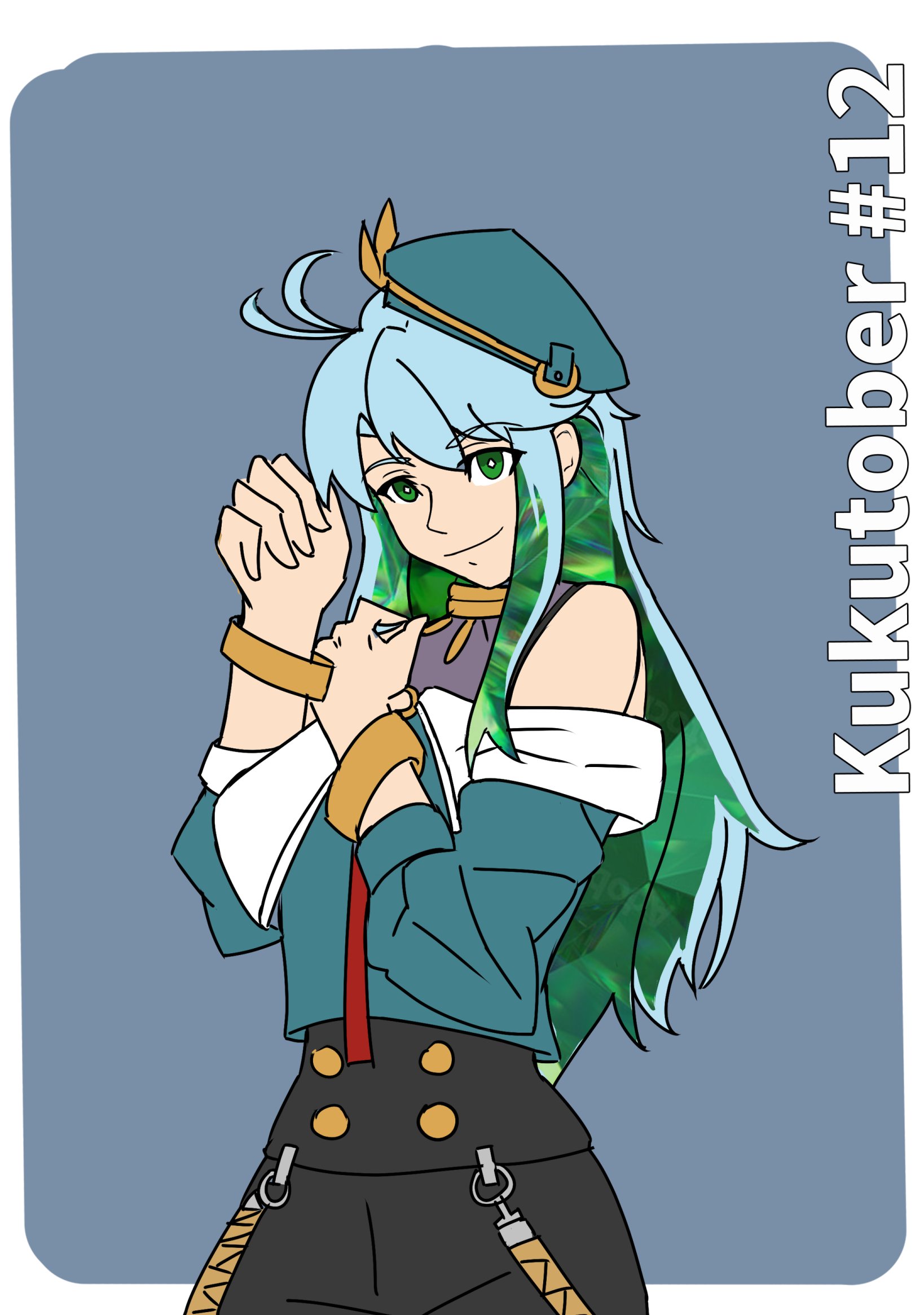 1girlbare shouldersberetblack shirtblack shortsborderbraceletbuttonscolored inner haircosplaycostume switchdouble-breastedfloating hairgreen eyesgreen hairgreen hatgreen jacketgrey backgroundhand on own chesthatjacketjewelrylong hairlong sleeveslooking at viewermakentetsumulticolored hairoff shoulderoutside bordershirtshortssidelockssolotwo-tone hairvery long hairwhite border