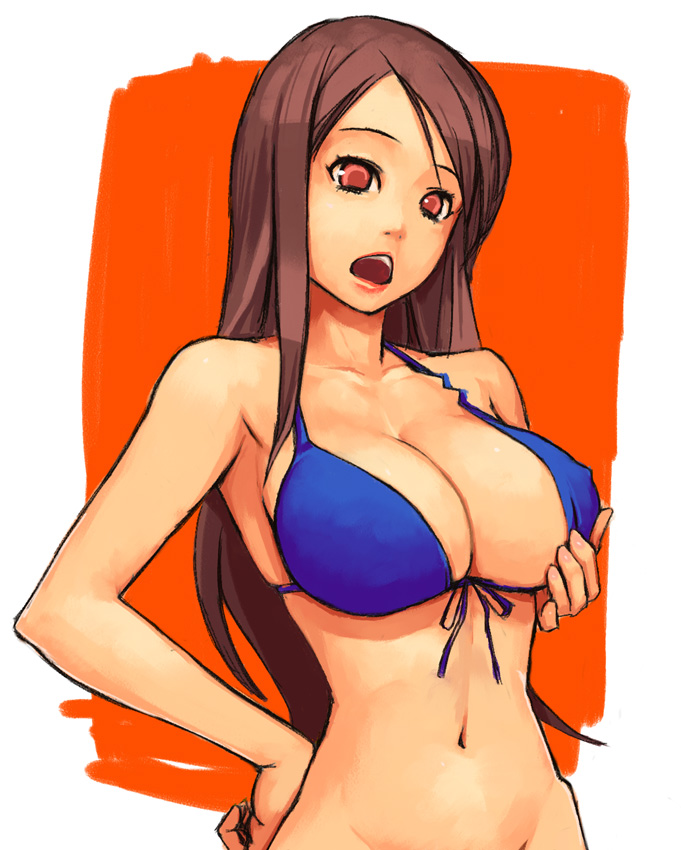 1girlbikinibikini top onlyblue bikinibottomlessbreast liftbreastsbrown haircleavagefemale focusfront-tie toplarge breastslong hairnavelout-of-frame censoringpink eyessoloswimsuitupper body