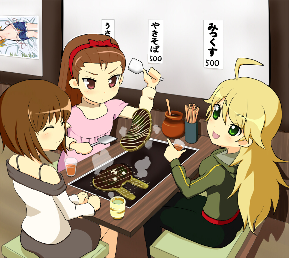 iizuka ena, shimazu yoshino, maria-sama ga miteru, eyebrows, 00s, 1girl, black eyes, blue background, brown hair, female focus, fringe trim, hand fan, japanese clothes, long hair, open mouth, simple background, smile, solo, zanshomimai