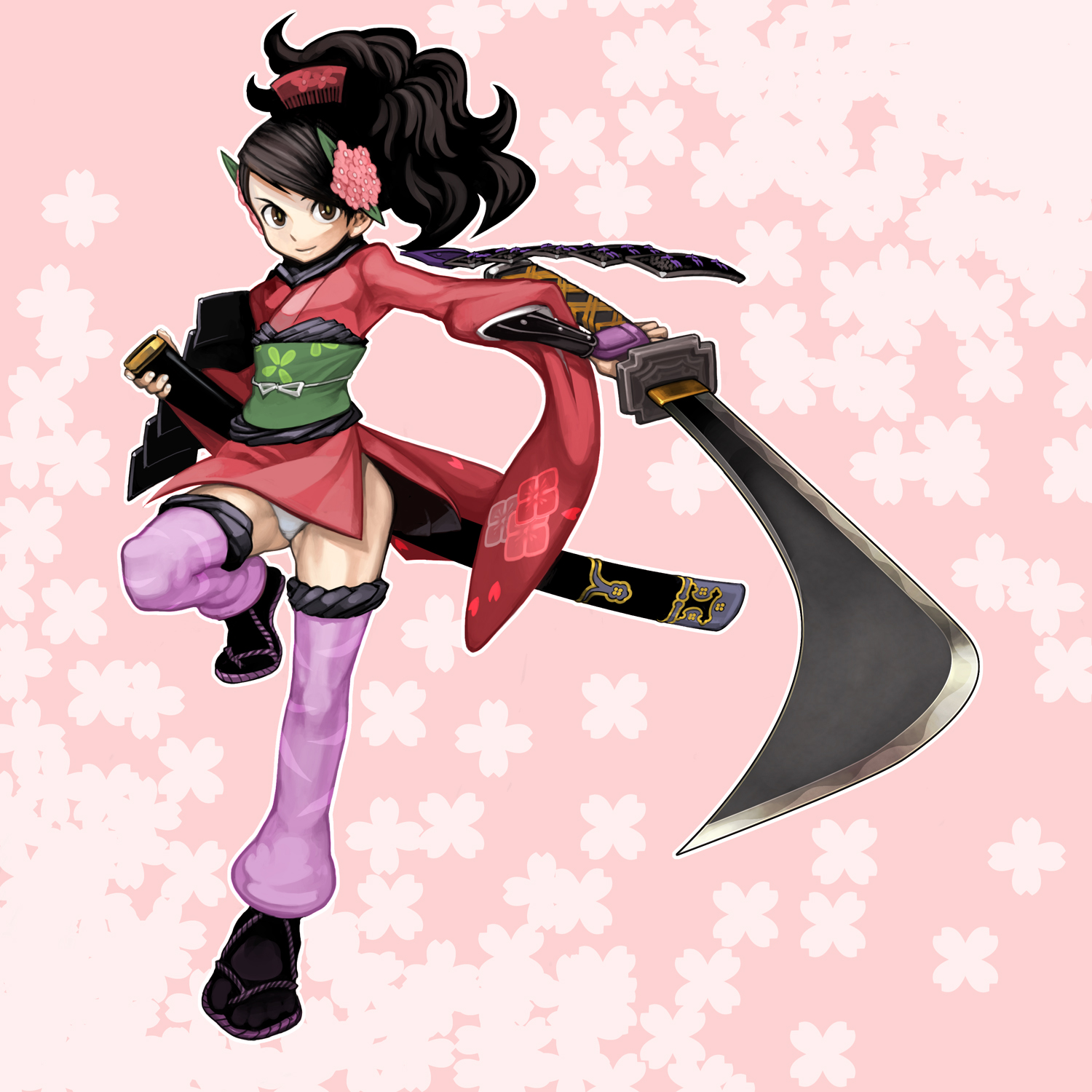 1girlblack hairbrown eyescombfemale focusfloral printflowergauntletshair flowerhair ornamentholdingholding swordholding weaponjapanese clotheskatanakimonopantiespantyshotperspectivesandalsscabbardsheathshort kimonosoloswordthighhighsunderwearweapon