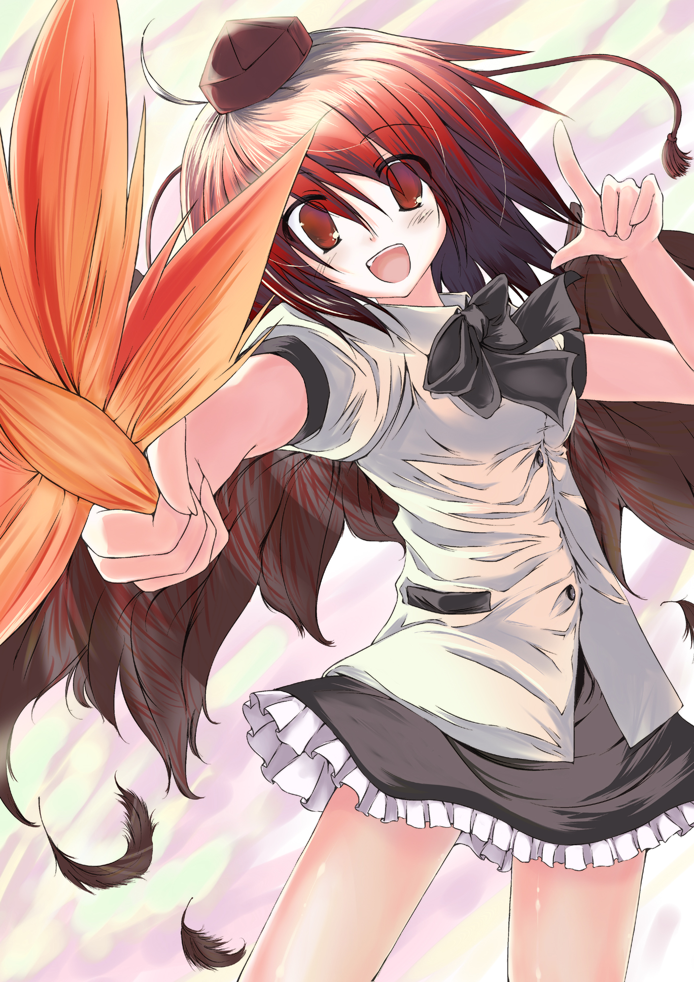 1girlblack wingsfeathersfemale focushand fanhatlooking at vieweropen mouthribbonshort hairskirtsolotokin hatwings