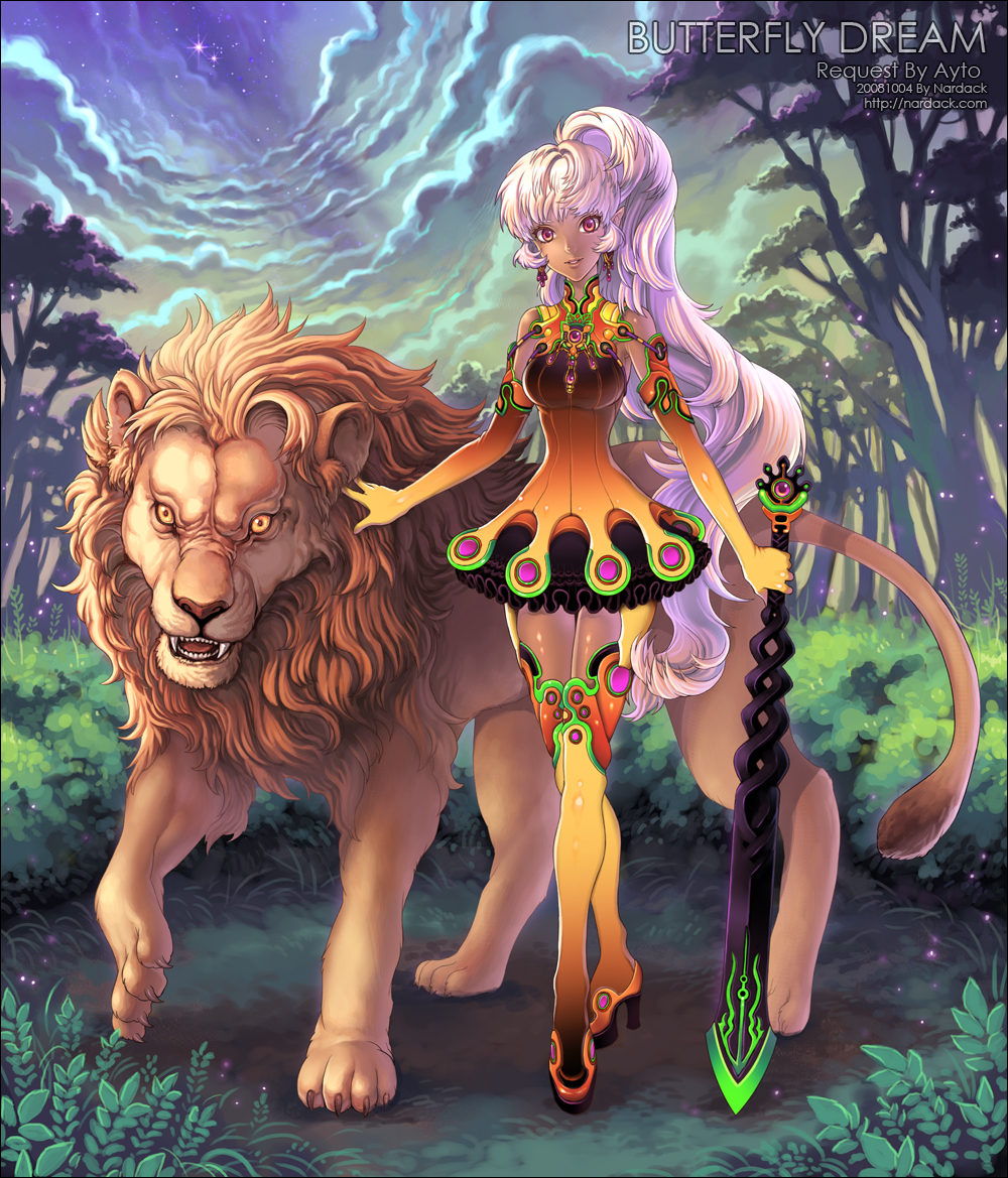 1girldresselffemale focusfull bodyhigh heelslegslionlipslong hairpointy earsponytailshoesskirtsoloswordthighhighsweaponwhite hair