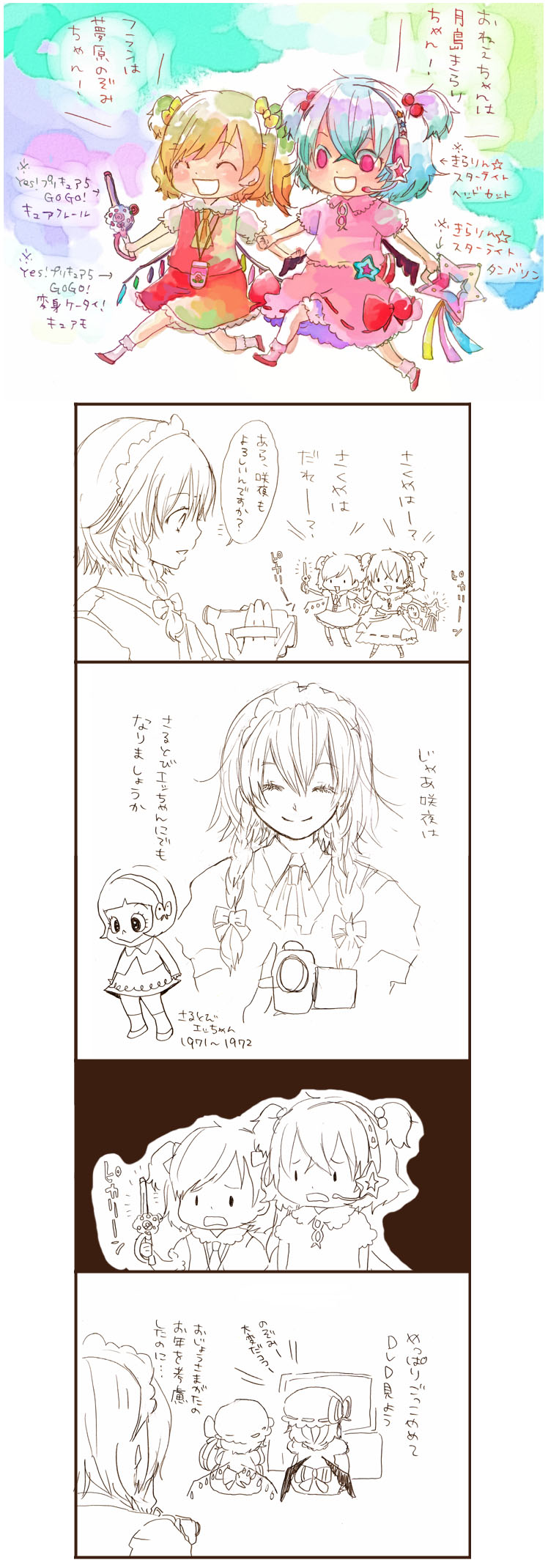 4girlsalternate hairstylebat wingsbraidcomicdressfemale focushairbandhatmultiple girlspartially coloredshort hairskirtupper bodywhite backgroundwings