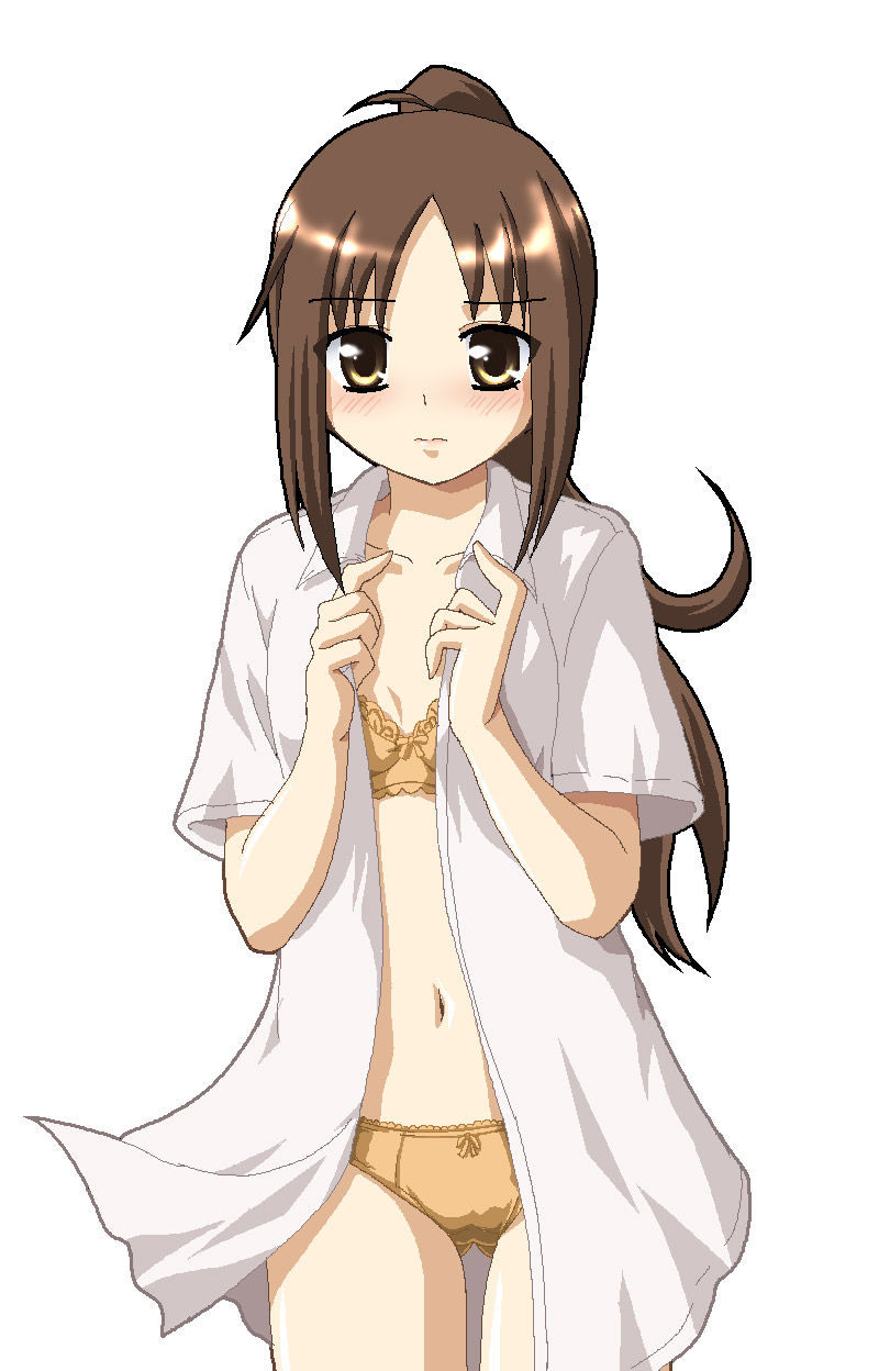 00s1girlbent overblushbrabrown eyesbrown hairclosed eyesfemale focusgenderswaplingerielong hairopen clothesopen shirtpantiesponytailshirtsolounderwear
