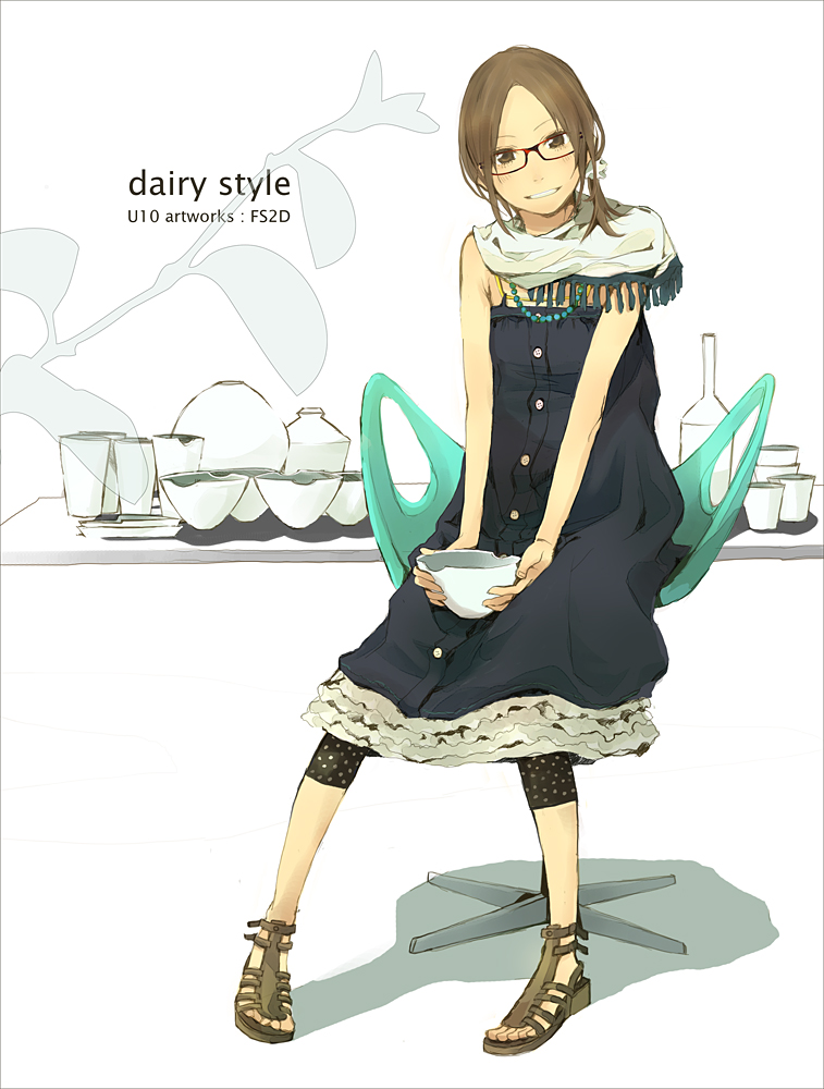 1girlblushbrown eyesbrown hairbrown sandalscupdressdrinking glassenglish textfashionfemale focusglassesjewelrynecklacesandalssittingsmilesolo