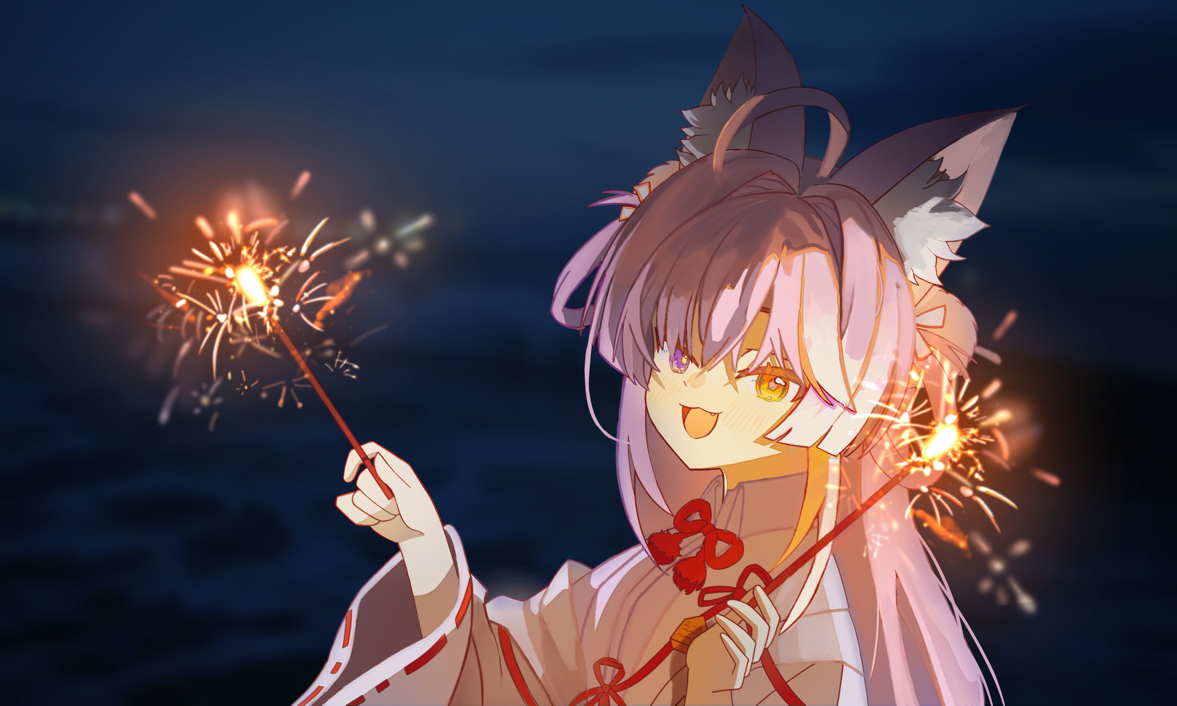 1girlahogeanimal ear fluffanimal earsfangfireworksfox earsfox girlhair between eyeshands upheterochromiaholdingholding fireworkslong bangslong hairlooking at viewerneck ribbonnightopen mouthoutdoorspom pom (clothes)purple eyespurple hairred ribbonribbonshirtsmilesolosparklerupper bodyvirtual youtuberwhite shirtwing collaryellow eyes