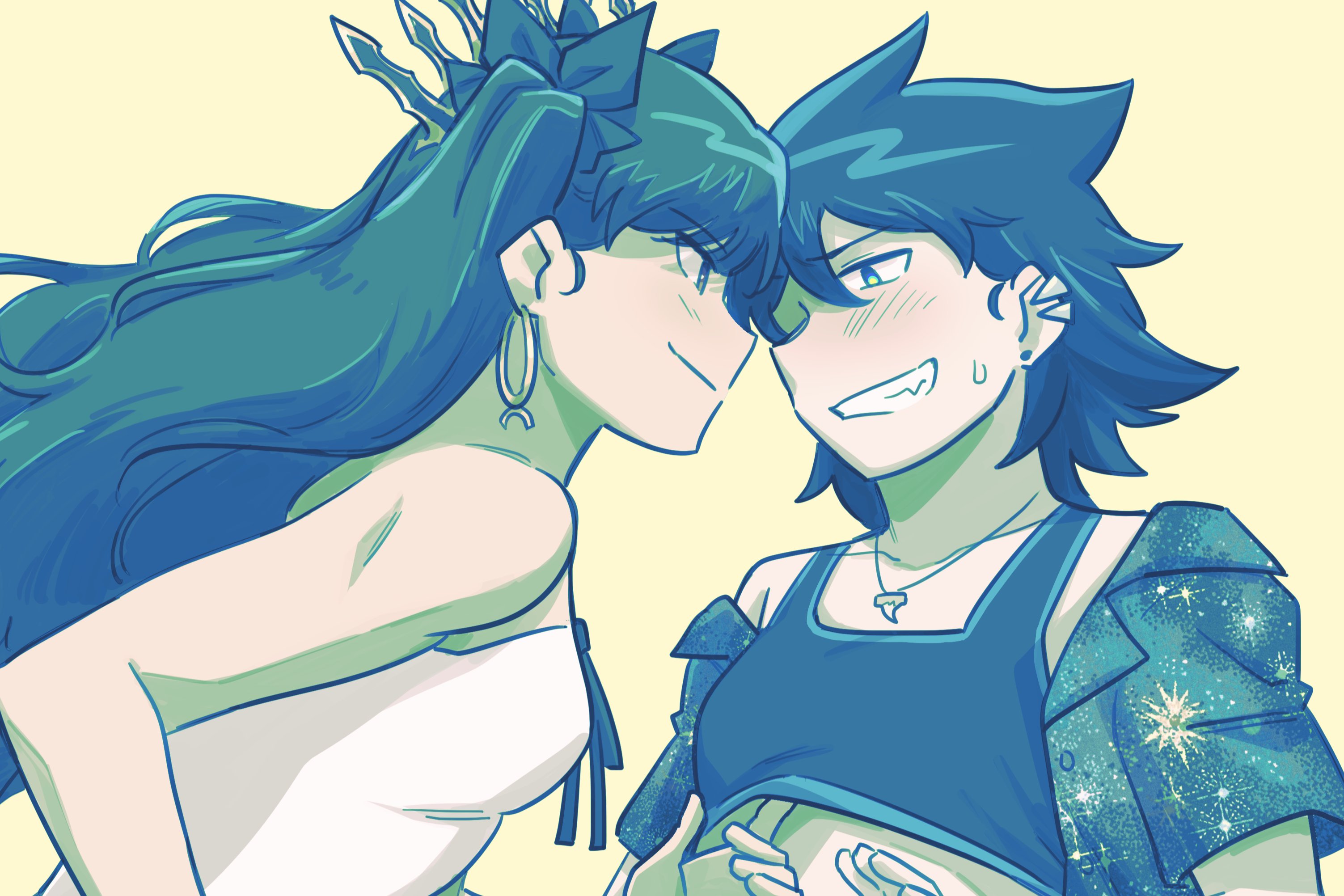 2girlsassertive femalebare armsblack hairblack ribbonblushbreastsclothes liftcollared shirtcrop topcrop top liftearringsfurrowed browgloveshair ribbonhand under clotheshoophoop earringsjewelryleaning forwardlong hairmulticolored tiaramultiple girlsnecklaceoc x canonoff shoulderreverse trapribbonshirtshort hairsleevelesssmall breastssmilestar (symbol)stud earringssweatdroptwintailstwo side upwhite shirtyellow backgroundyuri