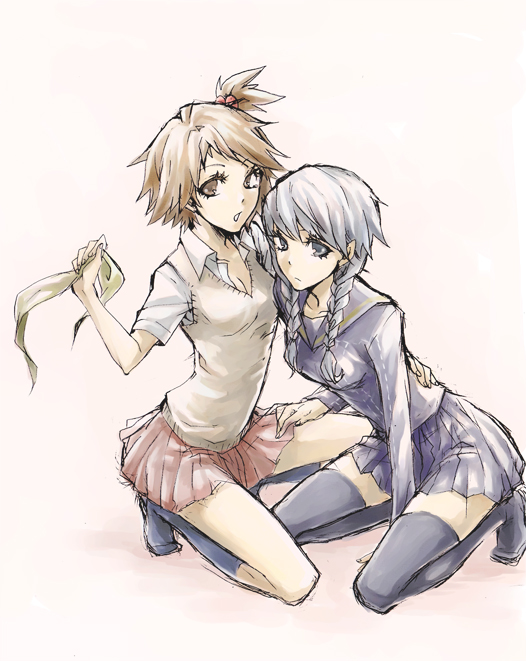 2girlsbraidbreastsbrown eyesbrown haircleavagegenderswapgenderswap (mtf)grey eyeshair bobbleshair ornamentkneelingmedium breastsmultiple girlsponytailschool uniformshort hairshort twintailsside ponytailskirtsocksthighhighstwin braidstwintailsvestzettai ryouiki