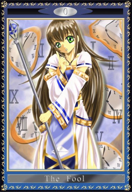 brown haircardcard (medium)clockdetached sleevesdressgreen eyeslong hairside slitstafftarottarot (medium)the fool (tarot)very long hair