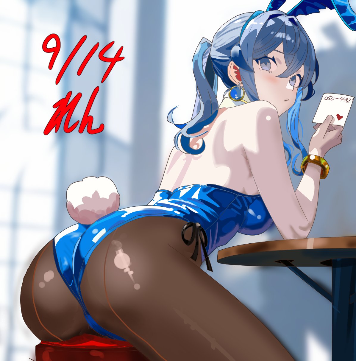 animal ear hairbandanimal earsartist nameassblack pantyhoseblue eyesblue hairblue leotardbraceletbreastscardcowboy shotdateddetached collarearringsfake animal earshairbandjewelryleotardlooking at viewerlooking backmedium breastspantyhoseplayboy bunnyponytailrabbit earsrabbit tailside-tie leotardsidelocksstoolstraplessstrapless leotardtabletail