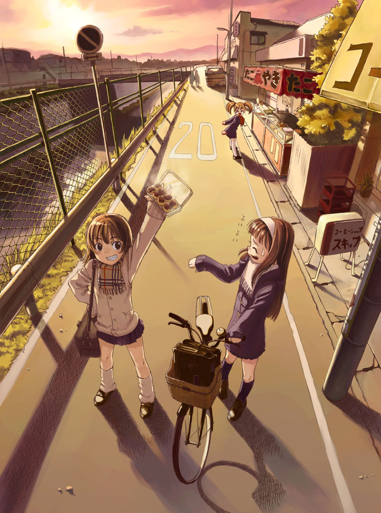 1boy3girlsarm upawningbagbasketbicycleblack socksblue coatblunt bangsbridgebriefcasebrown hairbuildingbushbuttonscarchain-link fencecityclenched teethclosed eyescoatdrainpipefencefoodgrinhairbandhand on own hiphip focusholdingholding foodkneehighslamppostleg warmerslong hairlong sleeveslooking at anotherloose socksmary janesmotor vehiclemultiple girlsoutdoorsoutstretched armoutstretched armspavementplaid clothesplaid scarfriverroadroad signscarfschool bagschool briefcaseshadowshoesshopshoulder bagsignsleeves past wristsslice of lifesmilesocksstreetsunlightsunsetsweatdroptakoyakiteethtwilighttwintailswhite coatwinter clothes