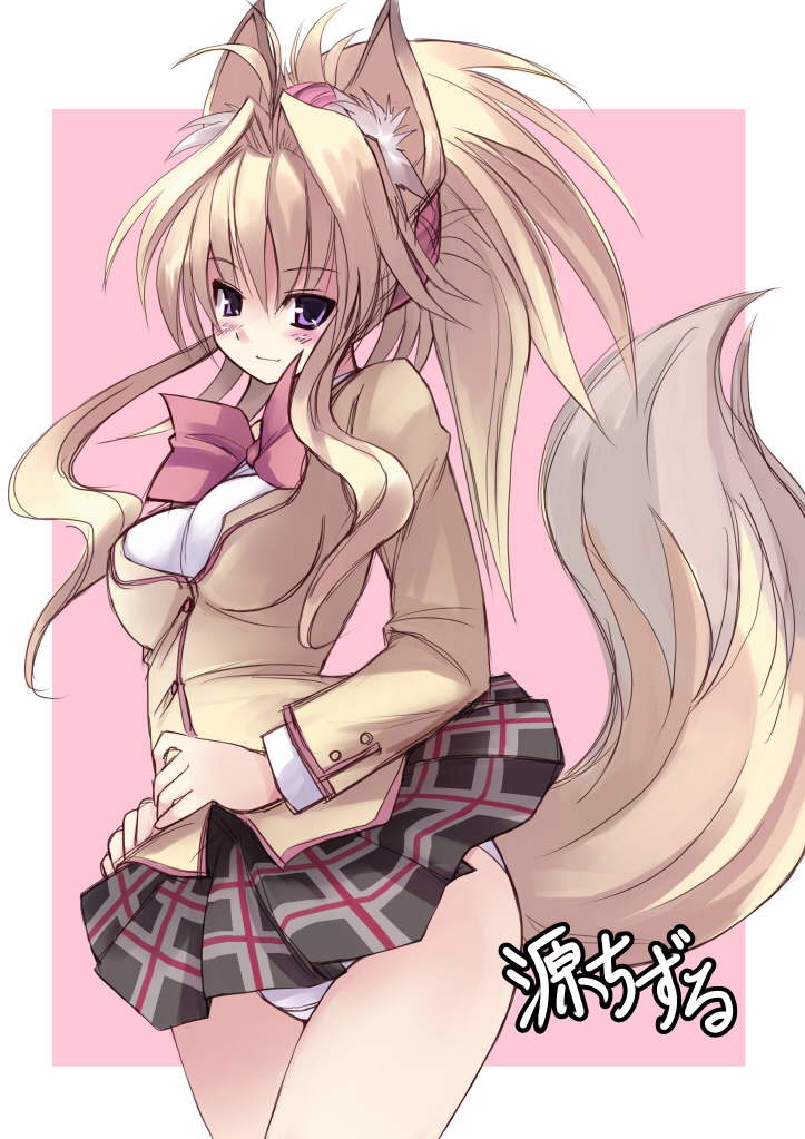 00s1girlanimal earsblazerblonde hairblushbowbowtiebreastsclothes liftfemale focusfox earsfox tailhair ornamentjacketlarge breastslong hairminiskirtpantiesplaid clothesplaid skirtpleated skirtpurple eyesschool uniformskirtskirt liftsmilesolotailunderwearwindwind lift