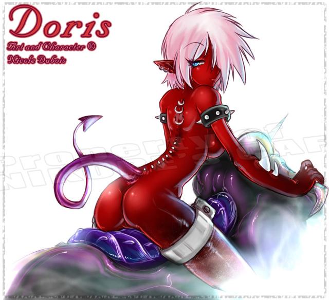 blue eyesbreastsdemondemon girldemon tailearringsjewelrymotor vehiclemotorcyclenicole dubois (artist)piercingpink hairred skinsideboobtail