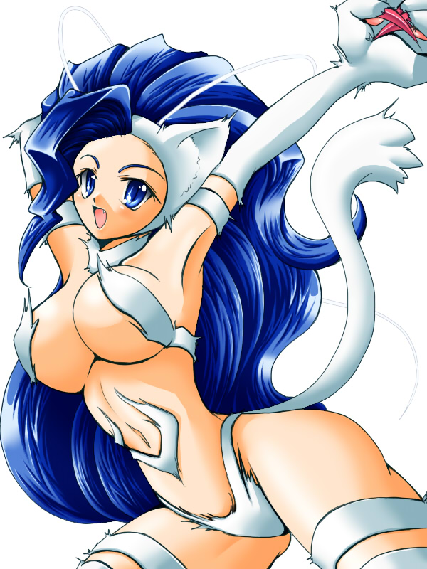 1girlanimal earsanimal handsarmpitsbig hairblue eyesblue hairbody furbreastscat earscat tailfangfemale focuslarge breastslong hairlooking backmatching hair/eyessolotail