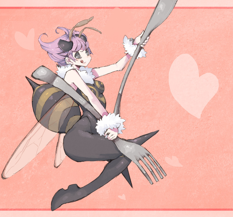 :p:q1girlantennaearthropod girlassbee girlfemale focusforkknifemonster girlno pupilsoversized objectpantyhosepurple hairshort hairsolid eyessolotonguetongue outwingswristband