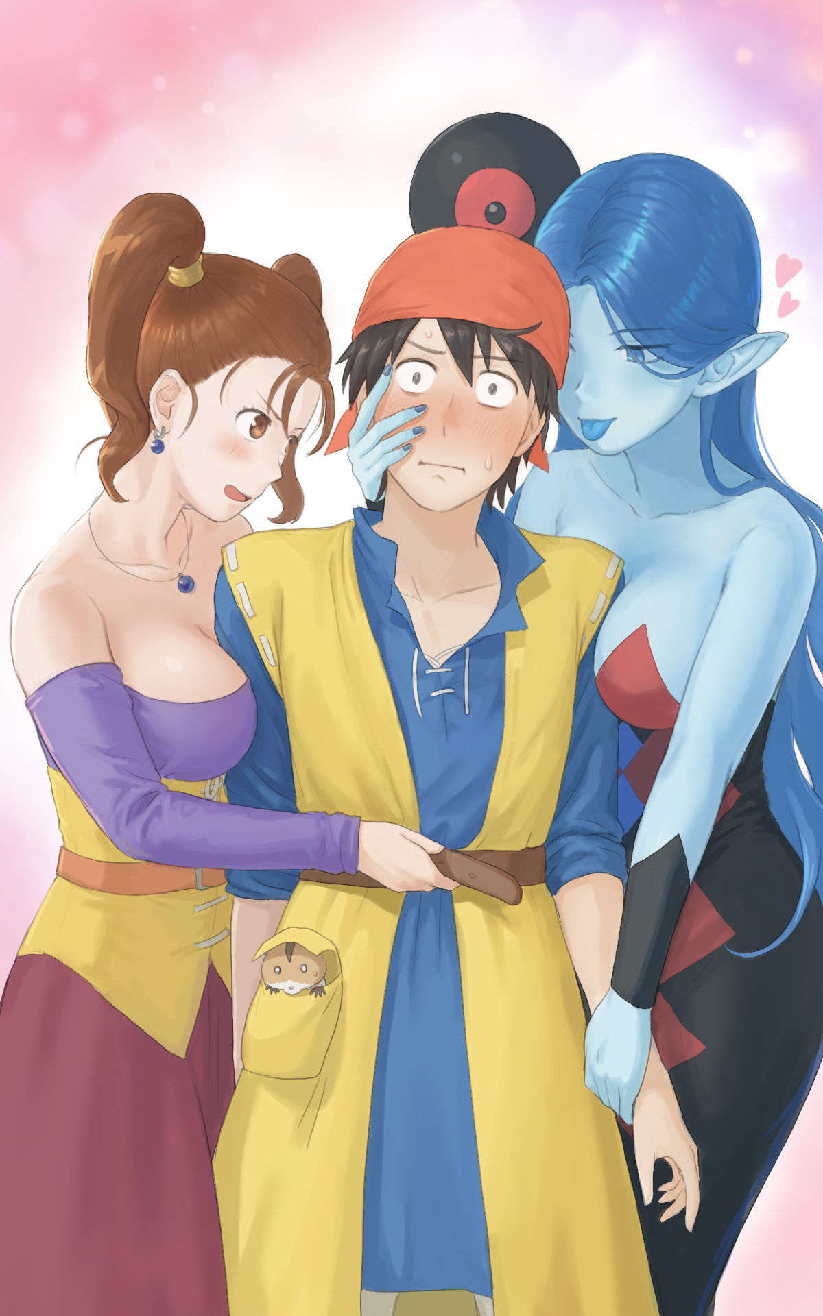 1boy2girlsbare shouldersbelt grabblack dressblue eyesblue hairblue skinblushbrown eyesbrown hairclothes grabcollarbonecolored skincorsetdetached sleevesdressheartjewelrylong hairlong sleevesmultiple girlsnecklacepointy earspurple shirtred dressred skirtshirtskirtstraplessstrapless dresssweatdroptwintailstwo-tone dressvery long hairyellow corset