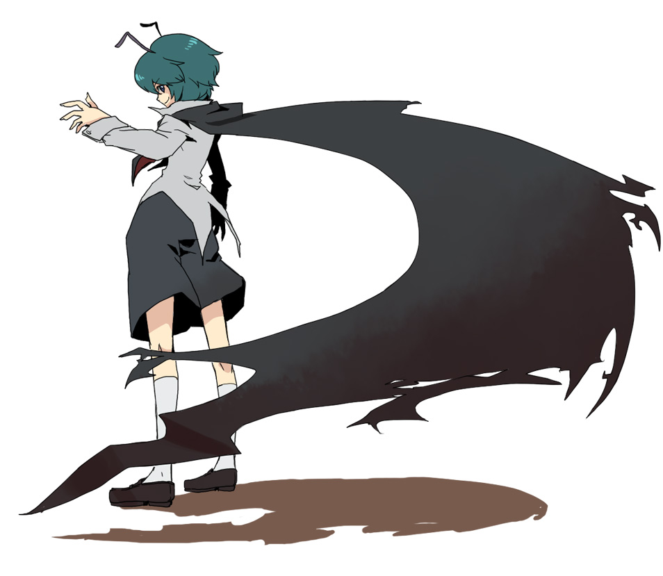 1girlandrogynousantennaebaggy pantscapefemale focusfull bodygreen hairpantssimple backgroundsolowhite background