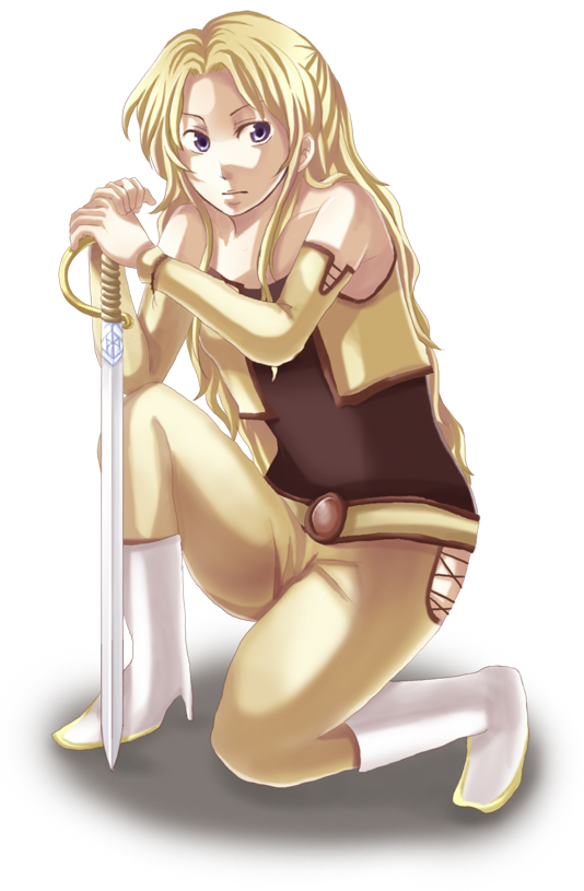 1990s (style)1girlblonde hairbootsdetached sleevesfemale focusfull bodygradient backgroundkneelinglong hairon one kneepurple eyesretro artstylesoloswordweaponwhite boots