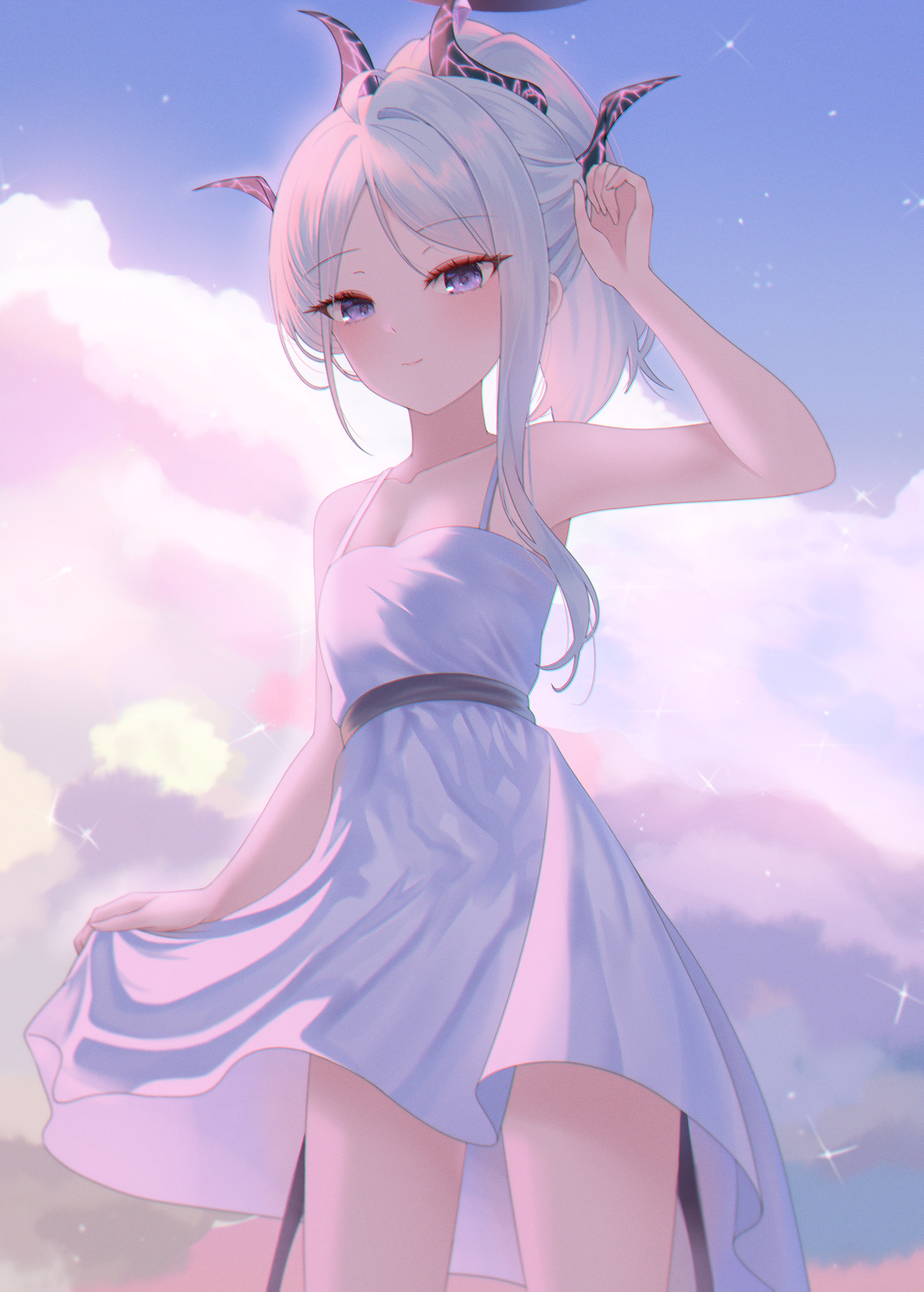 1girlalternate costumebare armsbare shouldersblack halobreastsclosed mouthcloudcloudy skycollarbonedemon hornsdiffraction spikesdresseyes visible through hairhalohornslooking at vieweroutdoorspurple eyesskysleevelesssleeveless dresssmall breastssmilestandingwhite dresswhite hair
