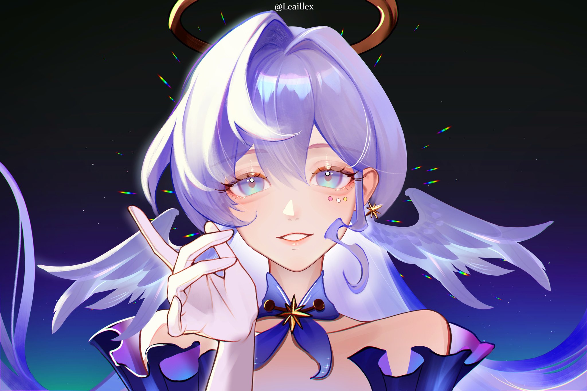 1girlbare shouldersblue eyesclose-upcollarboneearringseyelashesgloveshalohead wingsjewelrylong hairparted lipspurple hairsolotwitter usernamewhite gloveswings