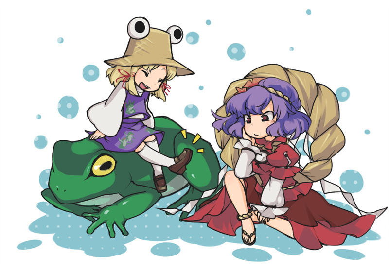 2girlsblonde hairfemale focusfroghair ornamenthatleaf hair ornamentmultiple girlspurple hairred eyesridingropesandalsshort hair