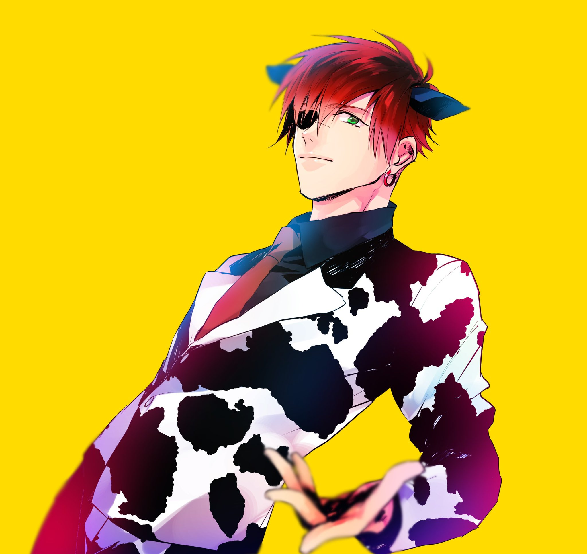 1boyanimal earsanimal printblack shirtblack suitcollared shirtcow earscow printcow print suitdress shirtearringseyepatchformal clothesgreen eyeshair between eyeshoop earringsjewelrykoshian (mruc9)long sleeveslooking at viewermale focusnecktieone eye coveredparted bangsprint suitred hairred necktieshirtshort hairsidelockssimple backgroundsolosuittwo-tone suitwhite suityellow background