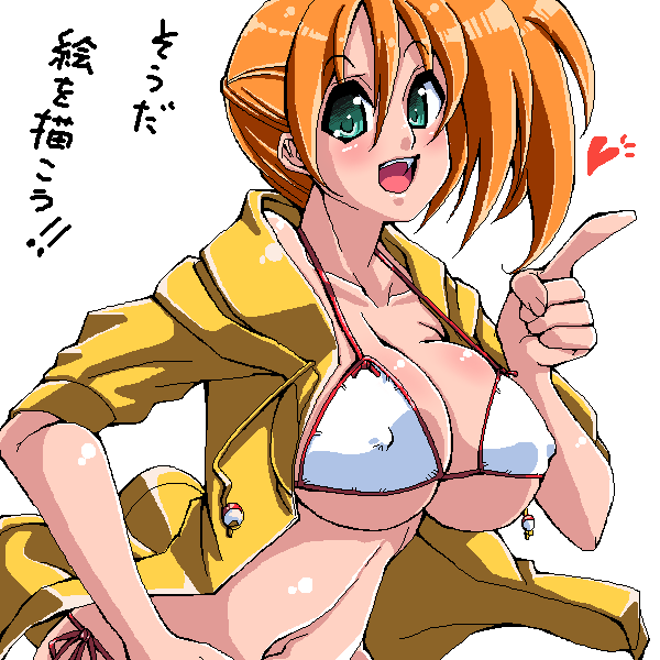 1girlbikiniblushbreastscovered erect nipplesfemale focusgreen eyesgym leaderhearthuge breastsjacketopen clothesopen mouthorange hairpoke ballred hairshort hairside ponytailside-tie bikini bottomsimple backgroundsoloswimsuitwhite background
