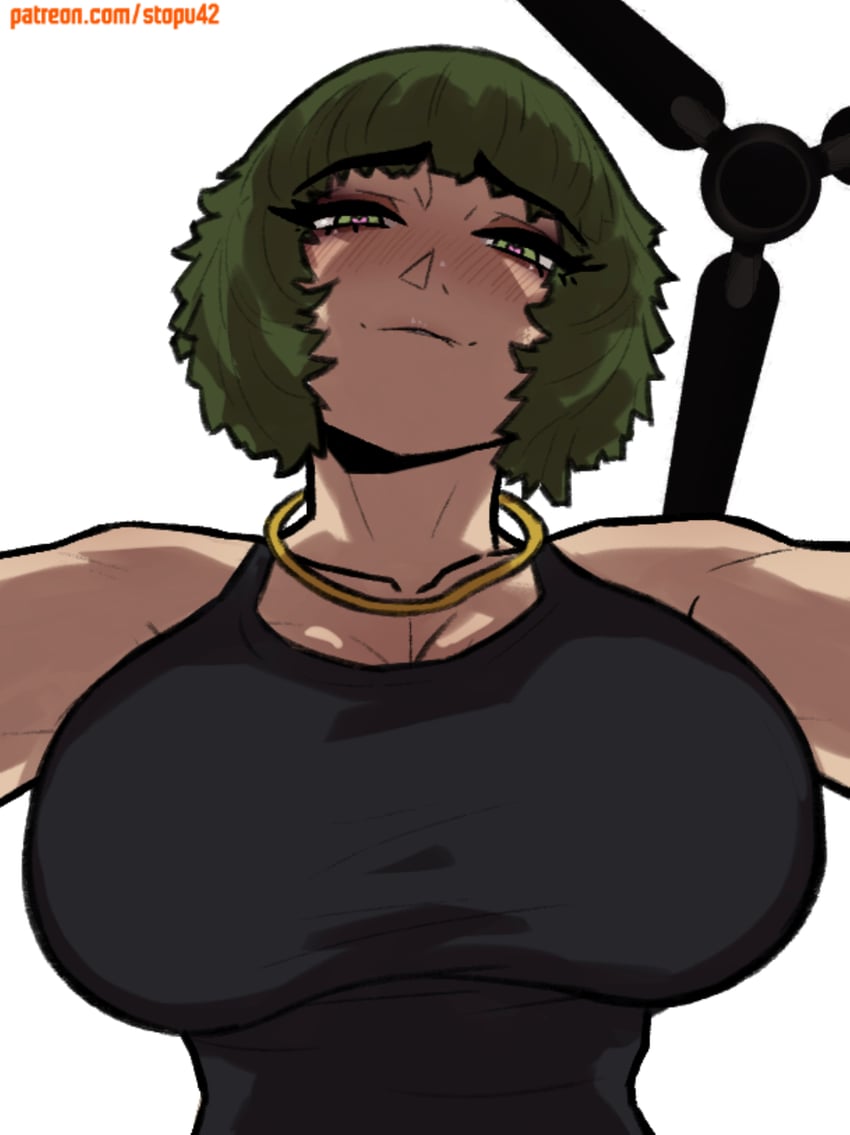 bare shouldersbiting own lipblack tank topblushbreastsceiling fanclosed mouthcollarboneeyelashesfemaleFlag for Deletiongold chokergreen eyesgreen hairheartheart-shaped pupilslarge breastslooking at viewerlooking downnosepink pupilsshort hairsmilesolostopusymbol-shaped pupilstank topupper body