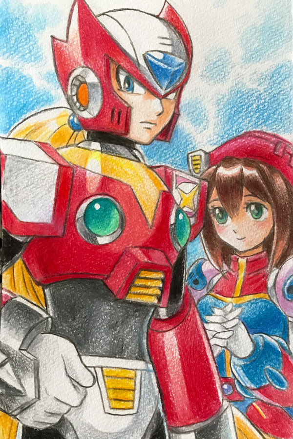 1boy1girlandroidarmorberetblonde hairblue backgroundblue eyesblushbreastsbrown hairchest jeweldressforehead jewelglovesgreen eyeshand on own hiphathelmetinterlocked fingersjewelrylong hairlooking at anotherlow-tied long hairmedium breastsmulticolored dressponytailred armorred hatred helmetrobotrobot earsrobot girlshoulder armorsimple backgroundupper bodywhite gloves
