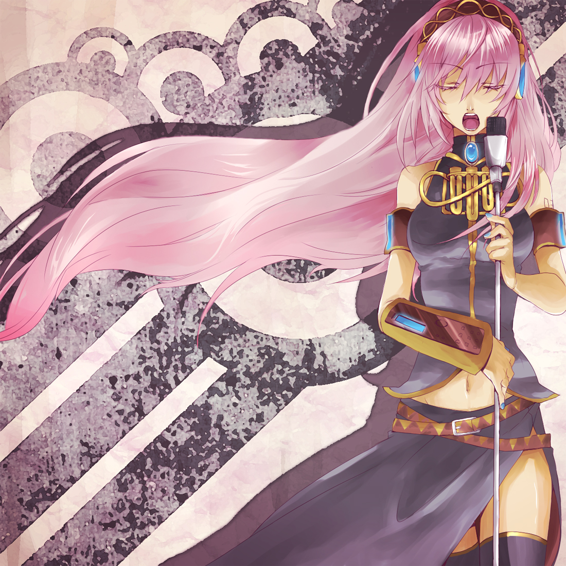 armbandbare shouldersclosed eyesheadphoneslong hairmicrophonemicrophone standmusicpink hairsingingsolothighhighswristband