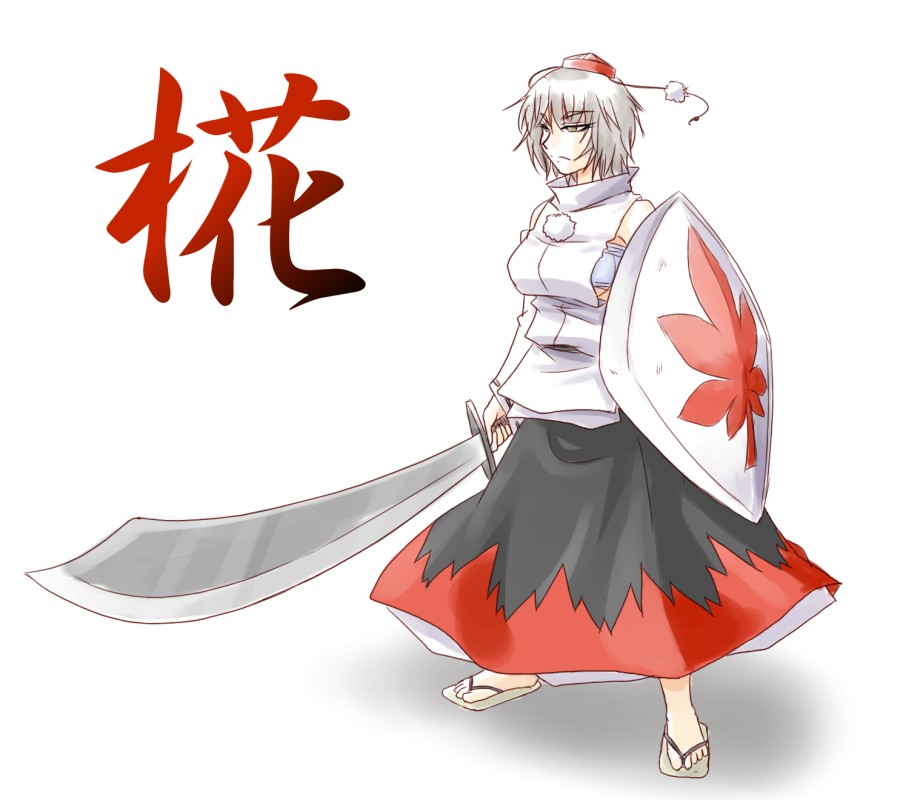 1girlbreastscharacter namedetached sleevesfemale focusfull bodyhatsandalsshieldshort hairsolostandingswordtokin hatweaponwhite background