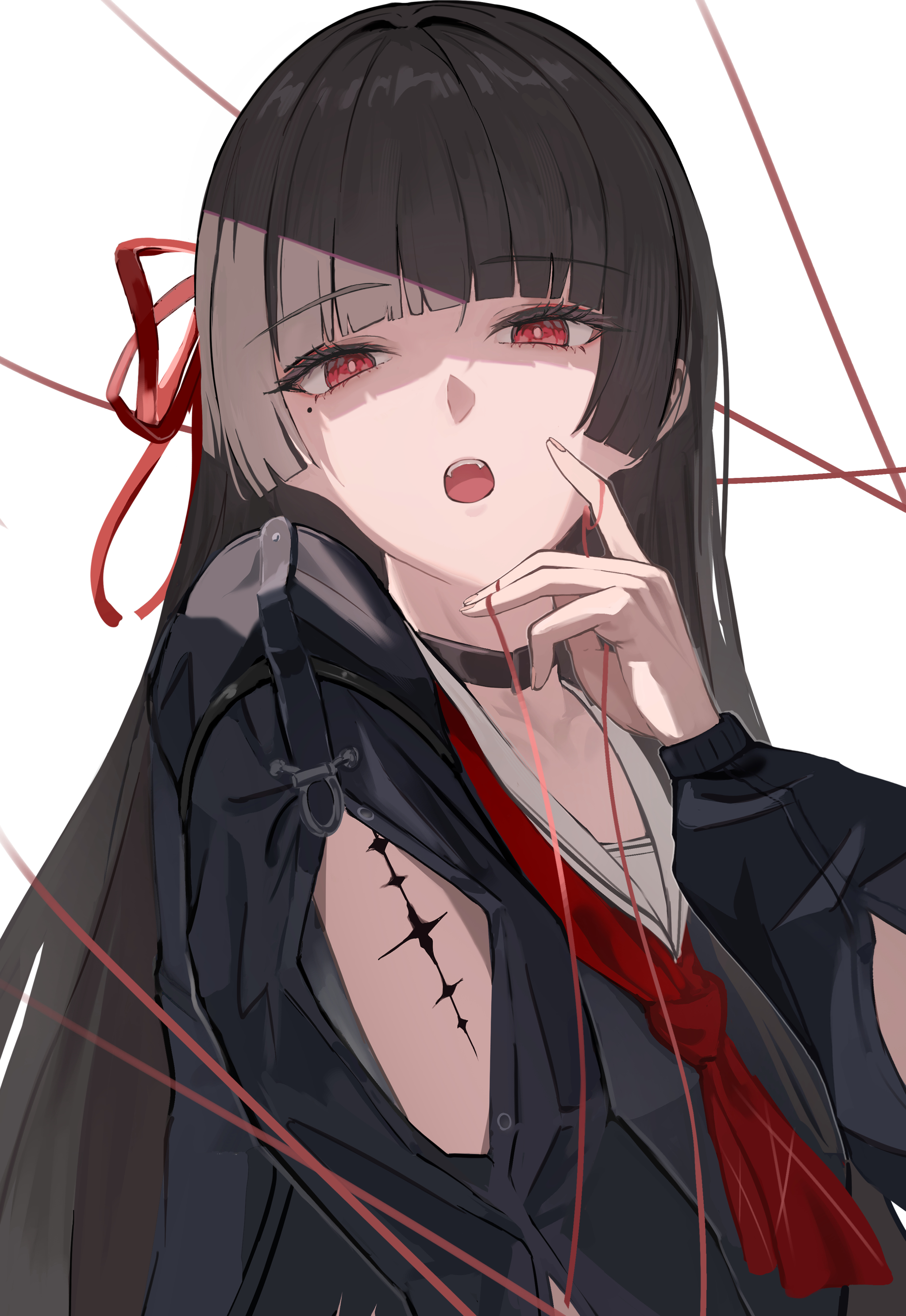 1girlarm cutoutblack chokerblack hairblack shirtblunt bangschokerclothing cutouthair ribbonhand uplong hairlong sleeveslooking at viewermolemole under eyeneckerchiefopen mouthred eyesred neckerchiefred ribbonribbonsailor collarshirtsimple backgroundsolotacet mark (wuthering waves)upper bodywhite backgroundwhite sailor collar