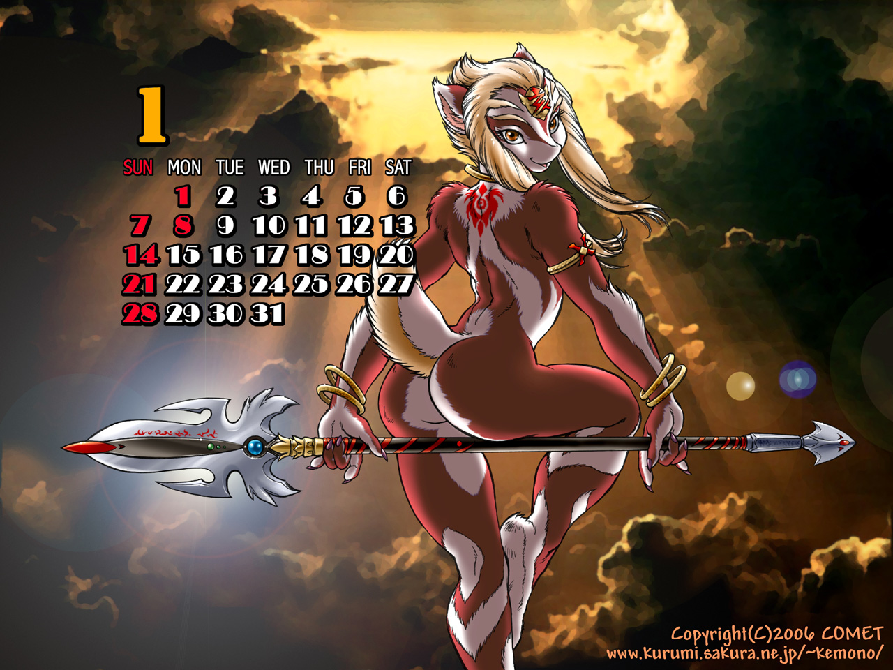 1girlanimal earsarmletartist nameassbarefootblonde hairbraceletcalendarclawscloudcolored skindatedfemale focusforehead jewelfrom behindfurryfurry femaleholdingholding weaponjewelrykneepitsleg uplens flarelooking at viewerlooking backnail polishneck ringnudeorange eyesoutdoorsparted lipspolearmpurple nailsred skinshort hair with long lockssidelockssittingskysmilesolospearsunsettailtattoowatermarkweaponweb addresswhite skin