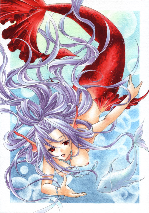 1girlblue hairbraceletbreastsbubblecompletely nudefemale focusfinsfishfloating hairhead finsjewelrylong hairmermaidmonster girlnecklacenipplesnudenudistoutside borderparted lipsred eyesscalessoloswimmingunderwaterupside-downvery long hairzenra